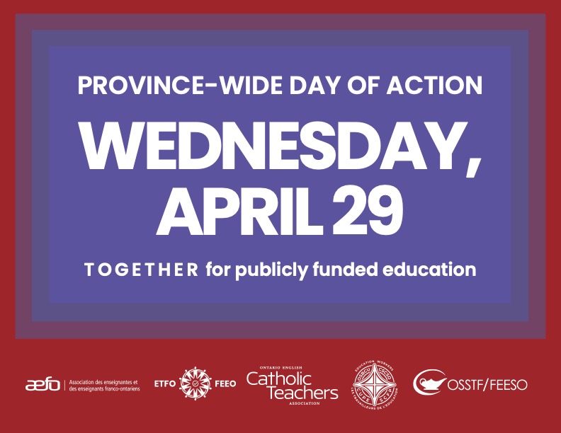 On April 29th, 2026 we will stand united across Ontario in solidarity for better public education. CUPE Members are asked to wear PURPLE and our partners will wear RED. Together we are stronger!